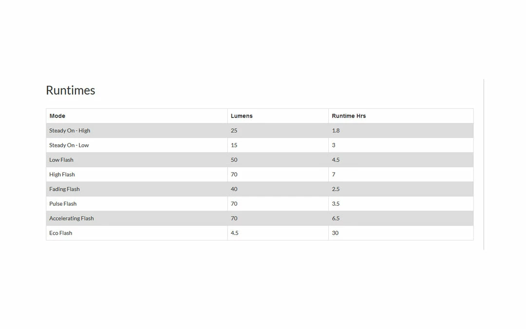 Blinder Mini’s surface mounted LEDs output 50 lumens with a 20 degree beam, so you’ll be seen from up to 800m away. They have a run time of up to 30 hours on eco-flash mode and come programmed with 5 light modes: steady high, steady low, strobe, fancy flash, and eco-flash.