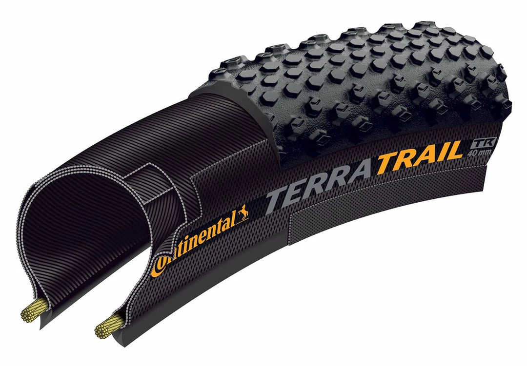 The Trail is the gnarlier of the two Terra variants which Continental offer. These tyres have been desgined with a raised shoulder tread to optimise cornering grip. The larger and slightly more spaced out centre line tread brings additional straightline grip and enables mud to clear the tyre more effectively.
