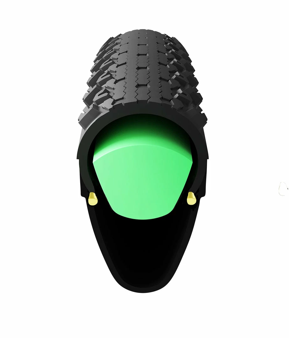 The Air-Liner is a high-quality polymer insert, which replaces a portion of the air volume in the tyre. This trait, combined with the shape, provides a tunable system that enhances your ride performances. The Air-Liner destroys the traditional compromise of stability versus grip and allows your tyres to remain stable, grippy and controlled, even at low pressures. Upon impact, the corner edges of the channel flex first, and progressively build to the thicker portion, as the tyre is compressed. This allows the tread to remain flexible, which increases traction, without sacrificing impact resistance. The round cross-section shape mimics the natural shape of the tyre and supports a greater contact area within the sidewalls of the tyre casing. Side-to-side tyre stability is increased, yet the tread remains soft and grippy. This improves cornering, climbing, and braking performance